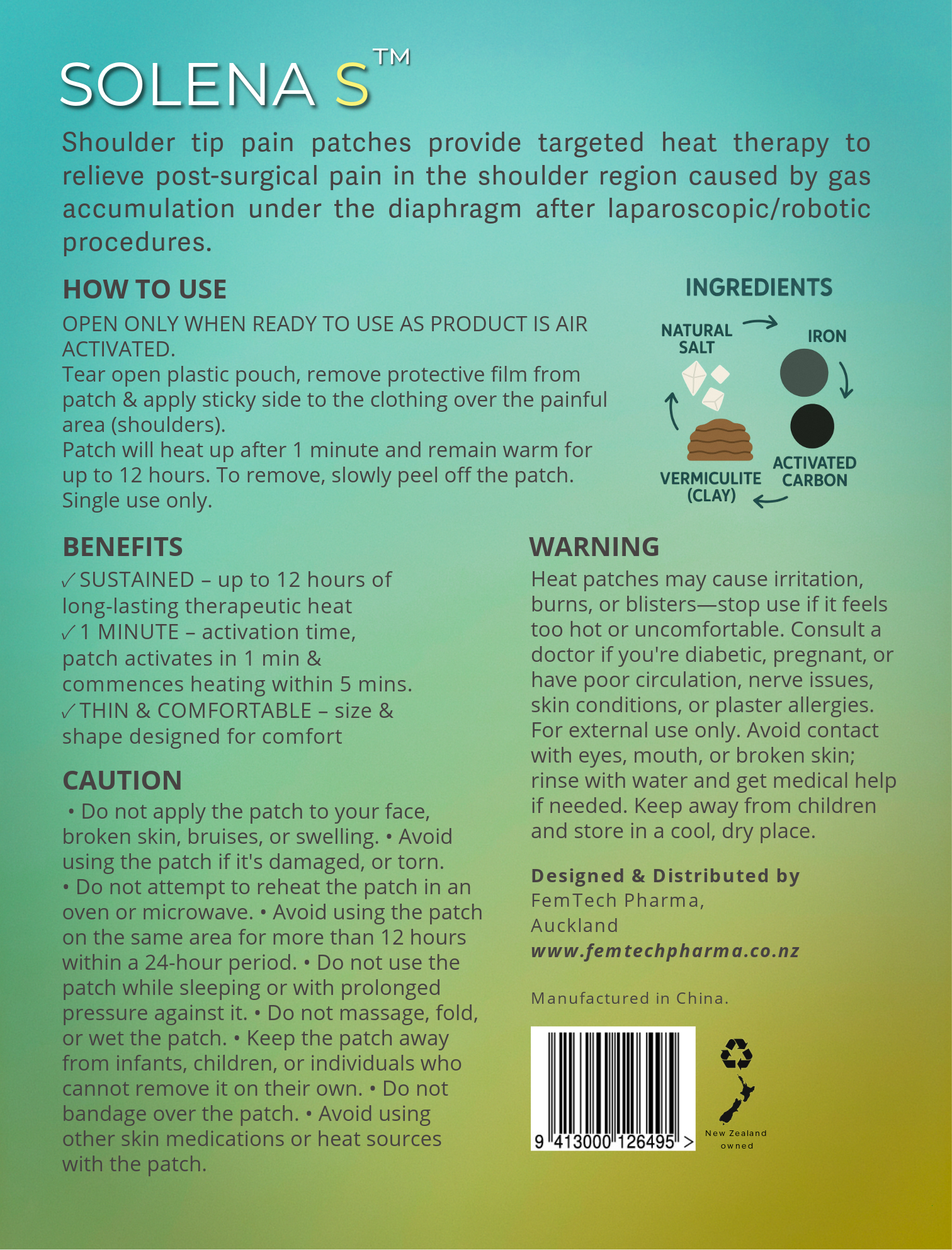 Solena S patch is a specially designed shoulder tip pain relief patch that provides targeted heat therapy to ease post-surgical pain. It is particularly effective in managing pain caused by gas accumulation under the diaphragm—a common side effect after laparoscopic or robotic surgeries. By delivering consistent warmth to the shoulder area, Solena S patch helps relieve referred pain and supports a more comfortable recovery experience.
